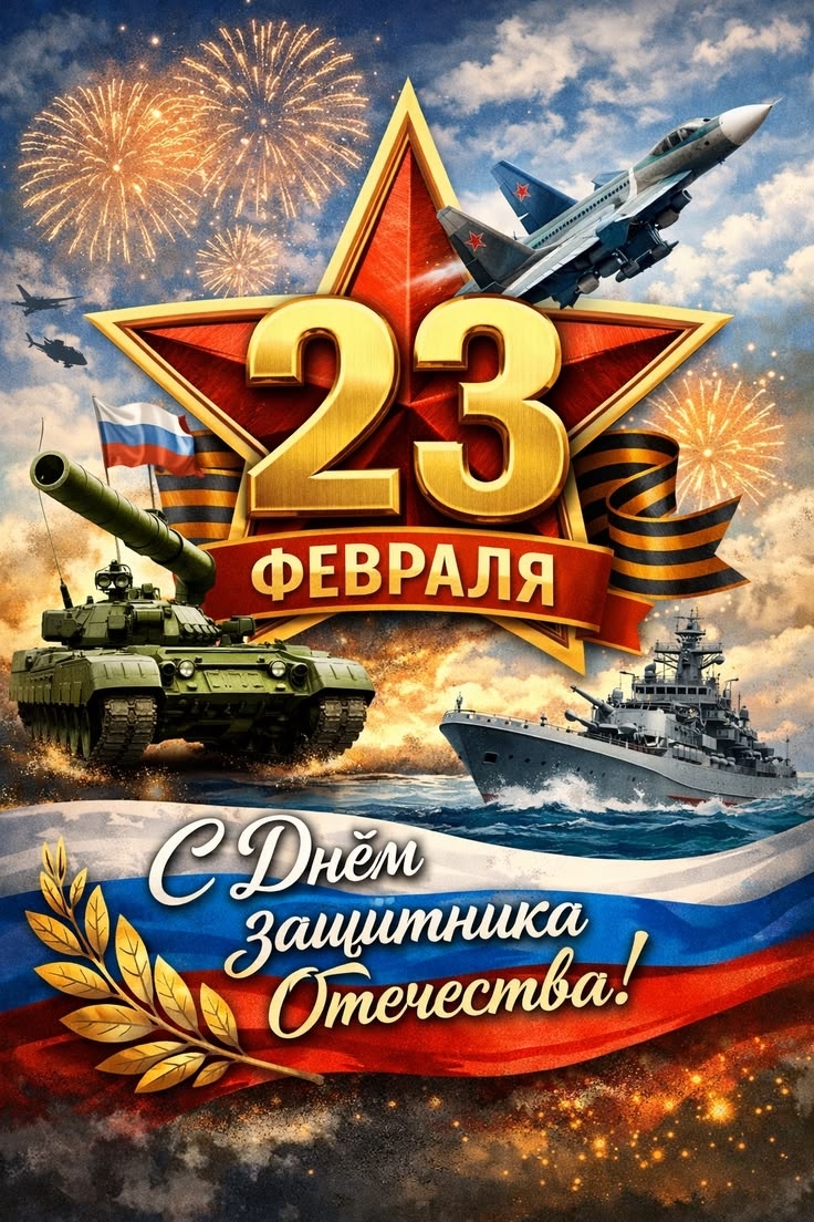 С Днём защитника Отечества! 23 февраля – не просто дата в календаре, это день памяти, мужества и силы духа Мы чествуем тех, кто стоит на защите Родины, оберегает мир и спокойствие наших семей, защищает страну и приносит уверенность в будущем. Желаем вам крепкого здоровья, благополучия и счастья в семьях. Пусть каждый день приносит радость, а ваша самоотверженность служит примером/