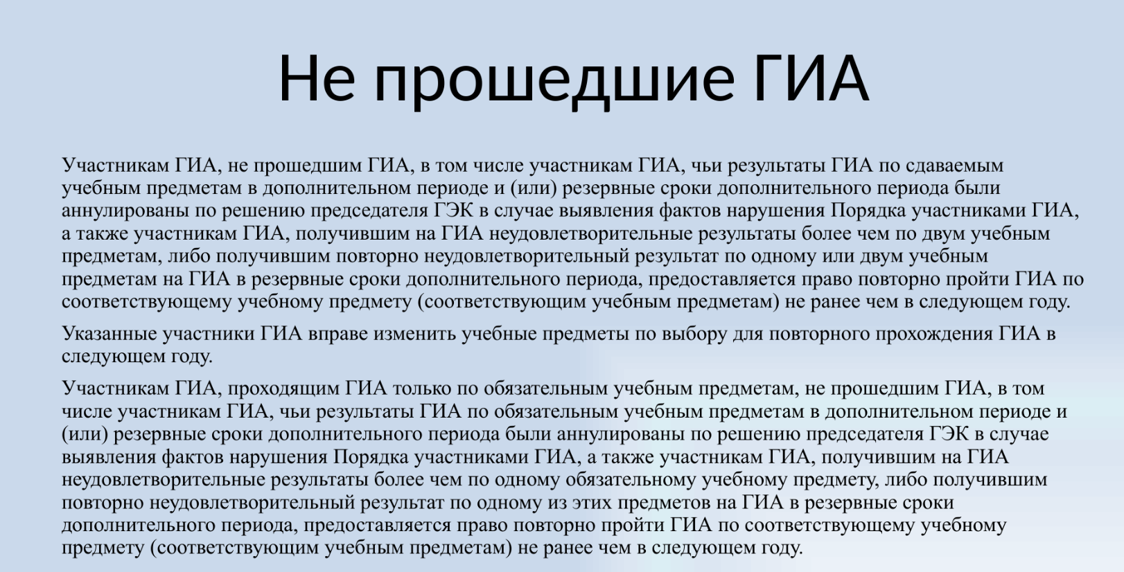 Согласно Порядку проведения государственной итоговой аттестации по образовательным программам основного общего образования к ГИА допускаются обучающиеся, не имеющие академической задолженности, в полном объеме выполнившие учебный план или индивидуальный учебный план (имеющие годовые отметки по всем учебным предметам учебного плана за класс не ниже удовлетворительных), а также имеющие результат «зачет» за итоговое собеседование по русскому языку.