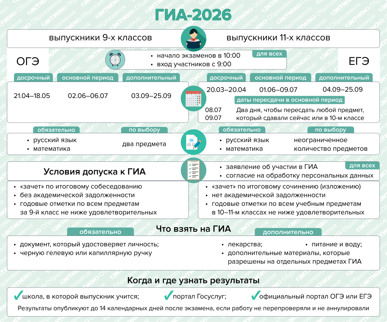 - Приказ Минпросвещения России, Рособрнадзора от 07.11.2025 № 800/1906 "Об утверждении единого расписания и продолжительности проведения государственного выпускного экзамена по образовательным программам основного общего и среднего общего образования по каждому учебному предмету, требований к использованию средств обучения и воспитания при его проведении в 2026 году"