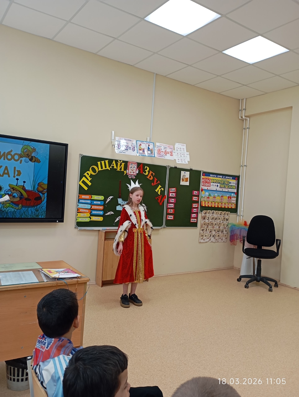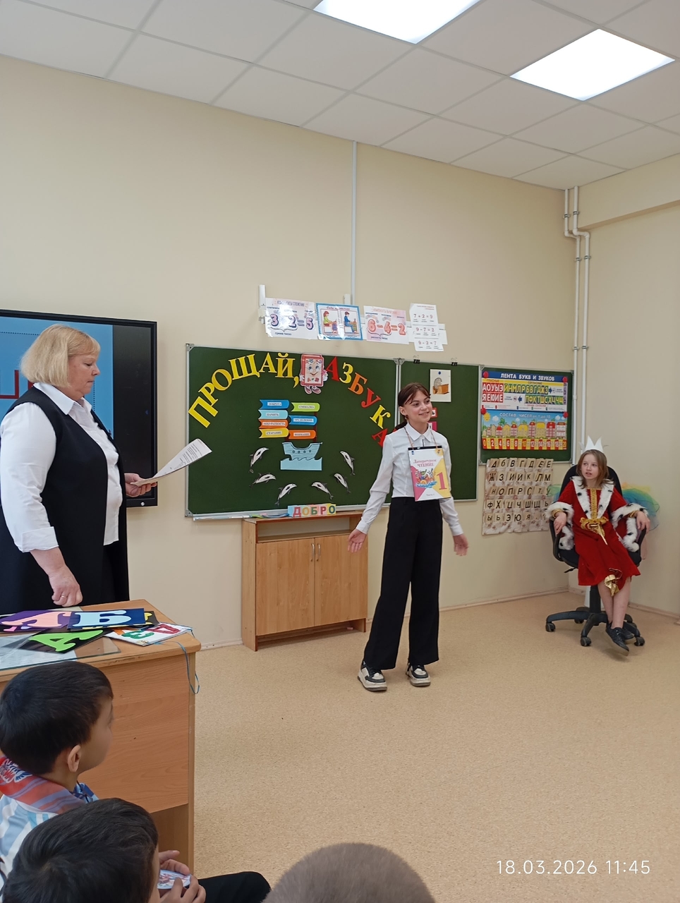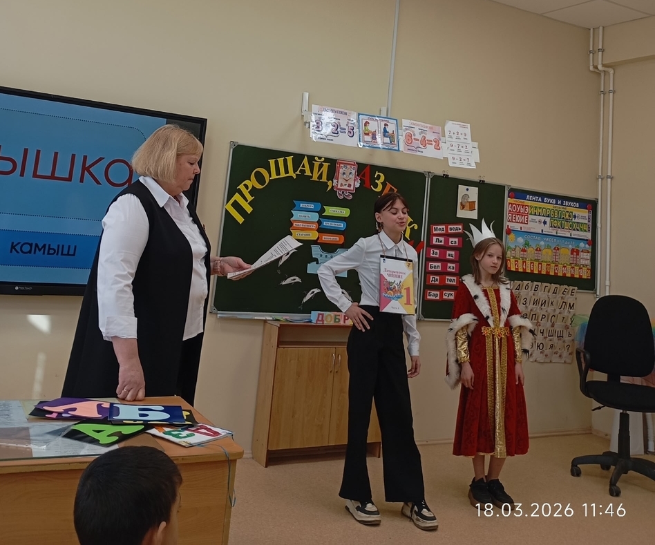 В 1 классе прошло праздничное мероприятие "Прощай, Азбука!" Сказочные персонажи украсили праздник. Ребята хорошо провели время. М.В.Константинова постаралась сделать этот день запоминающимся, радостным.