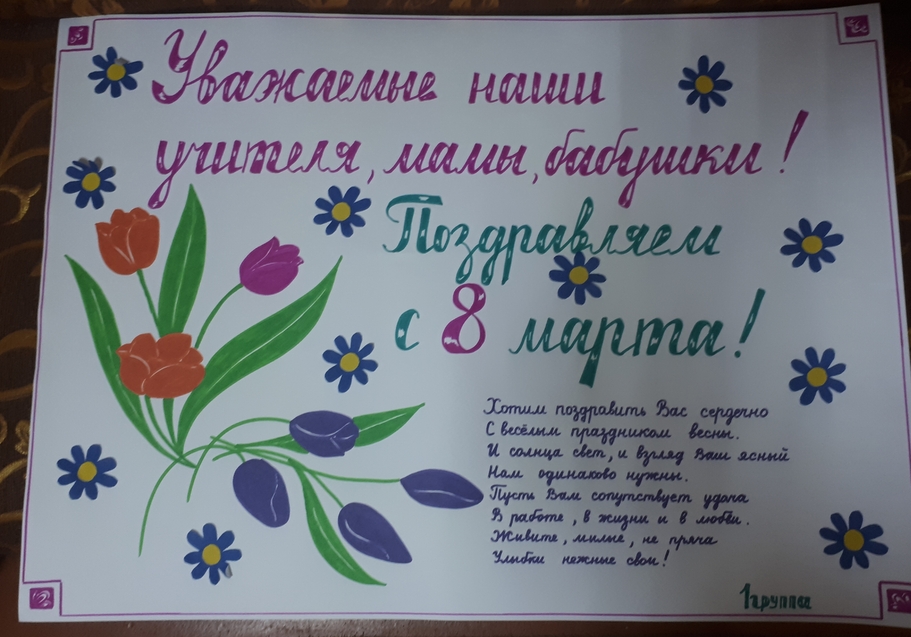 Воспитатель 1 группы Петрова Н.Н. подготовила с ребятами поздравительную газету к 8 марта. Рассказала о празднике, его истории. Ребята вырезали цветы и украсили ими газету.