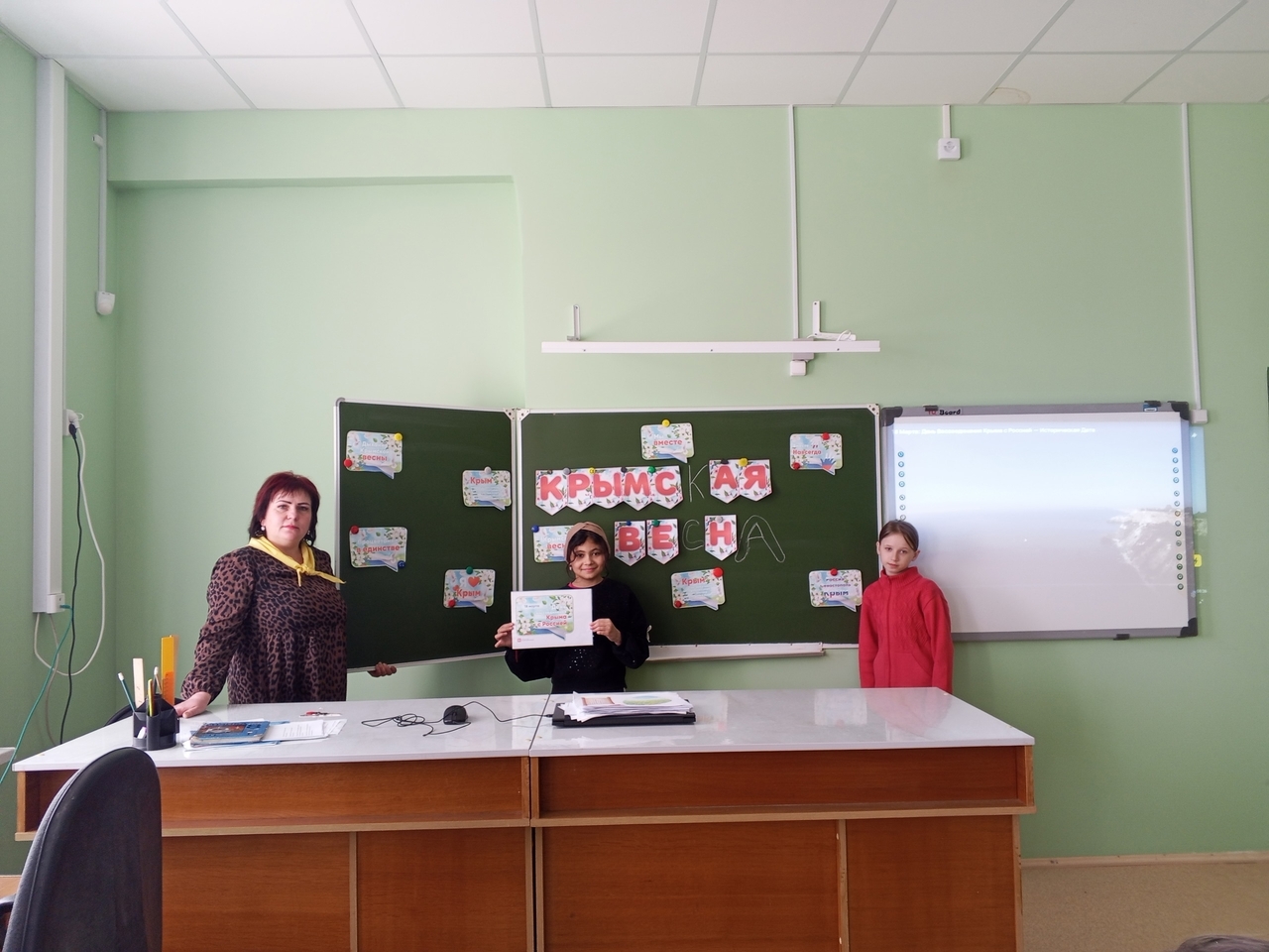 Детям была представлена презентация «Крым и Россия. Мы вместе». Они с интересом слушали рассказ Советника директора по воспитанию Логинову А.В. об истории Крыма, о событиях, произошедших в марте 2014 года, о достопримечательностях и природе полуострова. На познавательных занятиях: «Путешествие по истории», «Крым – это Россия» дети знакомились с символикой Крыма и России, изучали флаг и герб, слушали гимн Российской Федерации и Крыма .