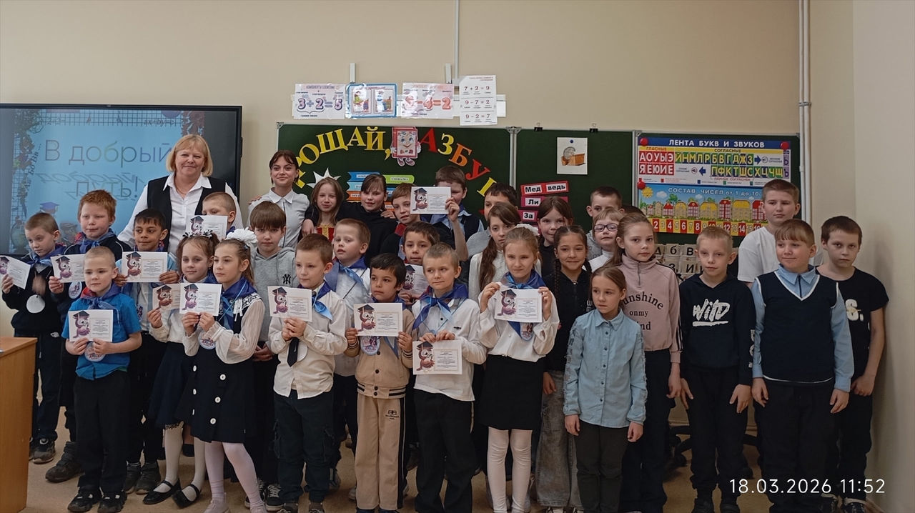 В 1 классе прошло праздничное мероприятие "Прощай, Азбука!" Сказочные персонажи украсили праздник. Ребята хорошо провели время. М.В.Константинова постаралась сделать этот день запоминающимся, радостным.