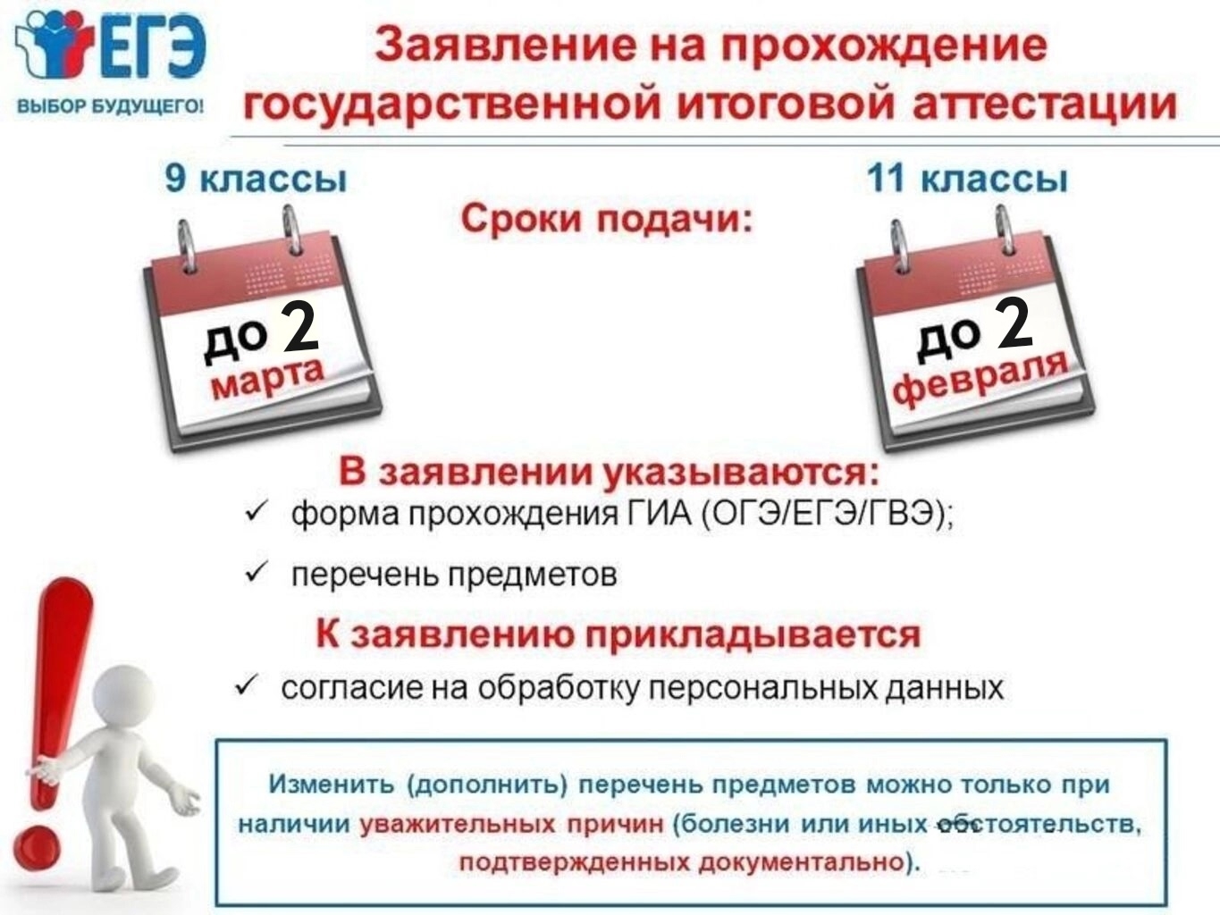Важно: заявление после установленного срока принимается только при наличии уважительной причины, подтвержденной документом. Решение принимает Государственная экзаменационная комиссия региона.